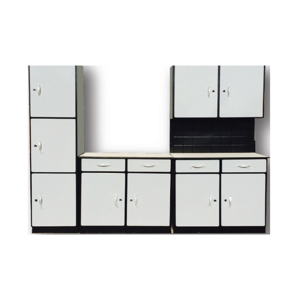 This affordable 3 piece steel kitchen unit offers 4 drawers to store utensils and 8 cupboards for crockery, pots and more. The kitchen unit is durable with a metal finish and can be purchased in either white or in metallic.