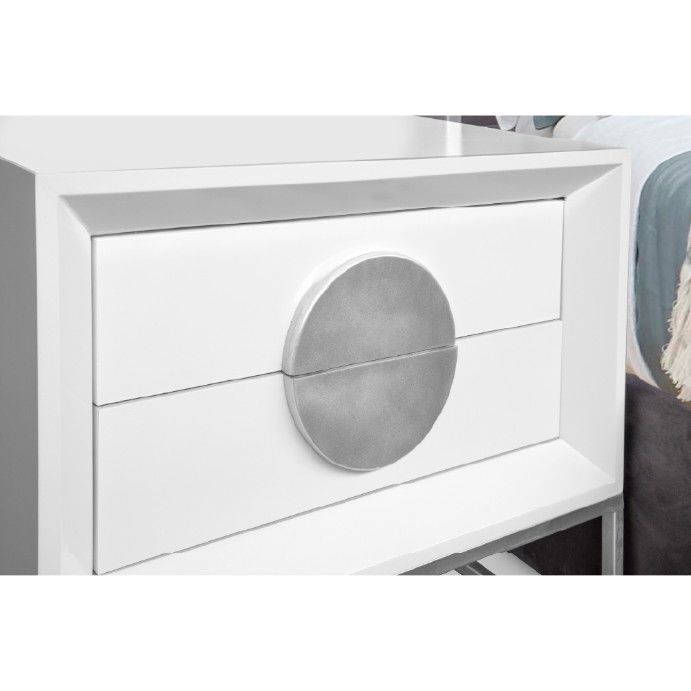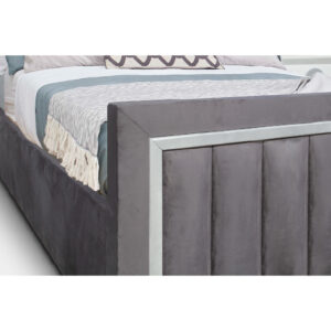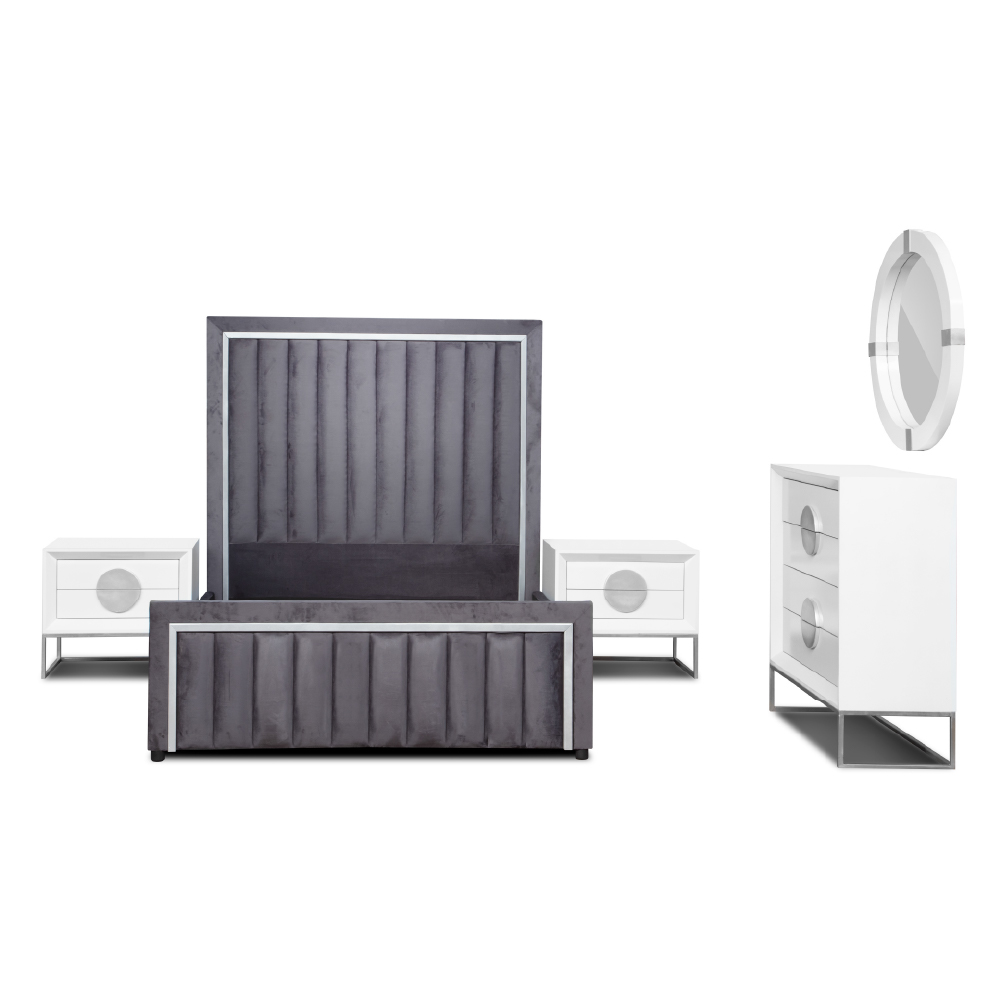 The modern 2 piece bedroom suite includes a headboard with 2 pedestals and a mirrored dressing table. The headboard is accented with Grey inserts to soften the white high gloss finish, adding elegance to the bedroom suite.