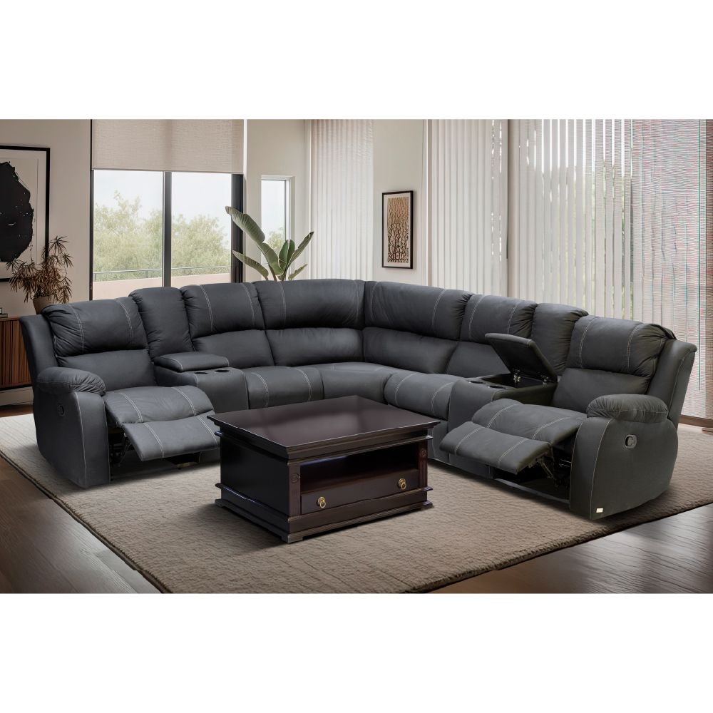 The perfect addition to any lounge or family room. Upholstered in durable fabric with contrast stitching, this set is not only stylish but also built to last. Maximum comfort for everyone. With 2 recliners at either end, you can easily find your preferred position for relaxation. With enough space to accommodate up to 5 people, the Brenda corner suite is the ideal choice for both style and functionality.