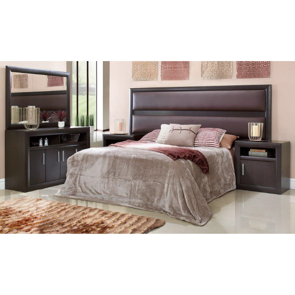 The modern design Marco 2 piece bedroom suite includes a headboard with 2 pedestals and a mirrored dressing table.The dressing table provides ample storage space and the headboard and pedestal set can accommodate a 152cm bed set (Queen Size bed set).